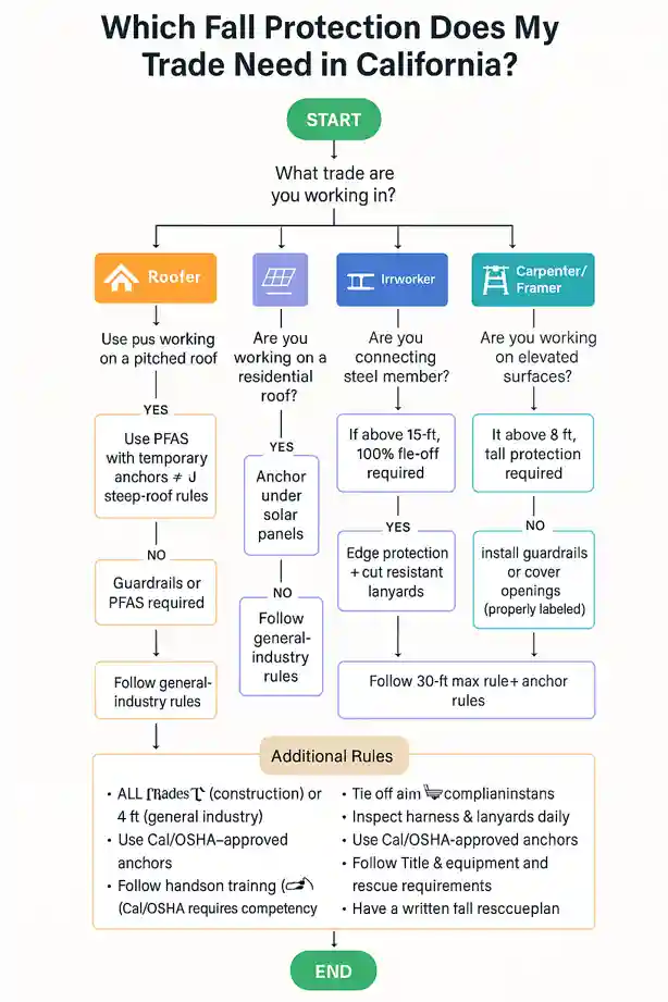 | Industry-Specific Rules | • Steel erection (Subpart R) • Nonspecific for roofers, solar installers, framers | • Roofing: §1730 • Steel erection: §1710 • Scaffolds: §1637 • Agriculture: §3456 • Telecom: §8615 • Solar installation (interpreted under multiple Title 8 sections) |