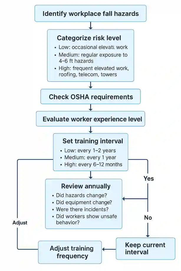 | General industry (non-construction, lower fall-risk workplaces) | Every 1–2 years | Retraining ensures recall and compliance even if not strictly required by rule. |