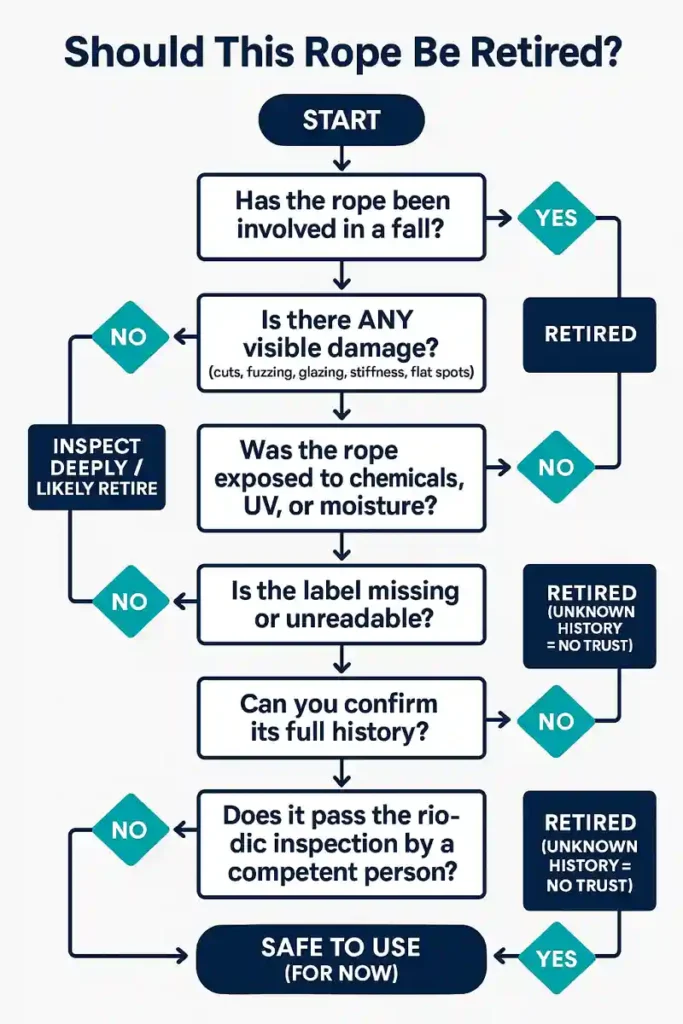 If that rope absorbed fall arrest forces even once, it’s retired on the spot.