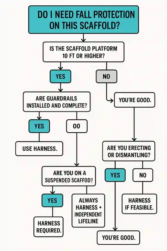 | Scaffolds Near Open Edges, Shafts, or Drop-Offs | Harness required | Exposure-based rule | If there’s an opening beside you, tie off—simple as that. |